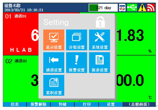 可設(shè)定設(shè)備名稱、系統(tǒng)時間、系統(tǒng)密碼、系統(tǒng)語言、記錄間隔、冷端補償、信號輸入類型、量程和單位、小數(shù)點位,測量值誤差修正設(shè)定、設(shè)定報警參數(shù)、設(shè)定變送輸出參數(shù)、打印組態(tài)參數(shù)、累積報表參數(shù)、通訊組態(tài)參數(shù)等。