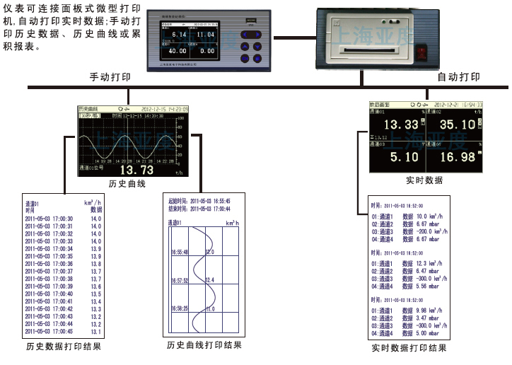 記錄儀可以現(xiàn)場配接微型打印機(jī),實現(xiàn)現(xiàn)場數(shù)據(jù)打印功能,可以打印出歷史數(shù)據(jù)、歷史曲線、定時打印等功能。