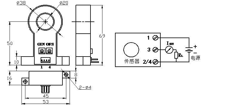 引腳說明:1,+24V2,0V(電源地)3,IOUT4,0V(電源地)OFS,零點(diǎn)調(diào)節(jié)GIN,幅度調(diào)節(jié)