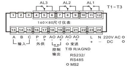 1~3點報警繼電器輸出,均為單常開觸點。選擇外供時,不能選T3 |