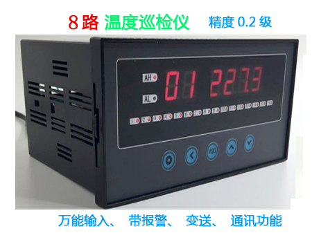 8路溫度巡檢儀:順序巡回測量8路輸入信號,測量的結果放在數(shù)據(jù)緩沖區(qū),供顯示和通訊使用。8路萬能輸入信號,帶2點報警點、可配通