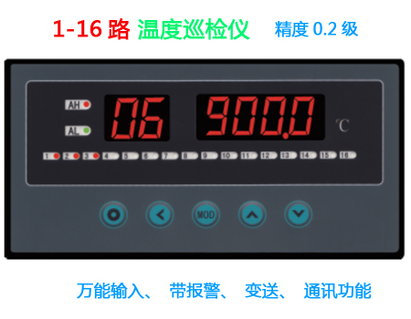 16路溫度巡檢儀:順序巡回測量16路輸入信號,測量的結果放在數(shù)據(jù)緩沖區(qū),供顯示和通訊使用。16路萬能輸入信號,帶2點報警點、可配通
