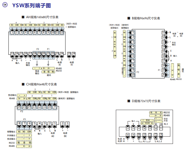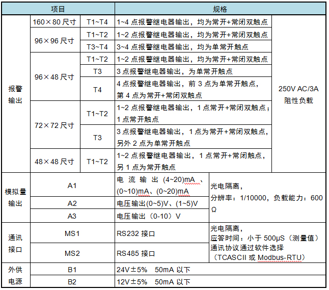 3、可選配1~4點報警輸出。包括測量值上限、測量值下限、偏差上限、偏差下限、偏差絕對值五種基本報警方式和與五種基本報警方式對應的五